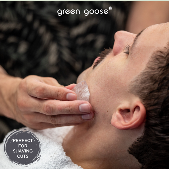 Onmisbaar tijdens het scheren! Voor het gebruik de aluin bevochtigen en aanstippen op de gewenste plekjes. Gemaakt van natuurlijk voorkomend kristalmineraal kalium. Mild antiseptisch om scheermesbranden en irritatie te kalmeren. Astringente eigenschappen die direct kunnen stoppen met kleine bloedingen, inkepingen of snijden. Het Alum zorgt ervoor dat de bloedvaten het bloedverlies vernauwen en stoppen. Kan op een vette huid worden gebruikt om droge plekken en puistjes te helpen. Ongeparfumeerd en geschikt voor de meeste huidtypes. Mogelijk het oudste aftershave product. green-goose