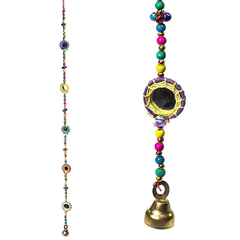 Kleurrijke slinger met een speels belletje aan het uiteinde. Leuk ter decoratie op de kinderkamer of elders in huis. Specifieke kleur of patroon kan afwijken van de getoonde foto.
