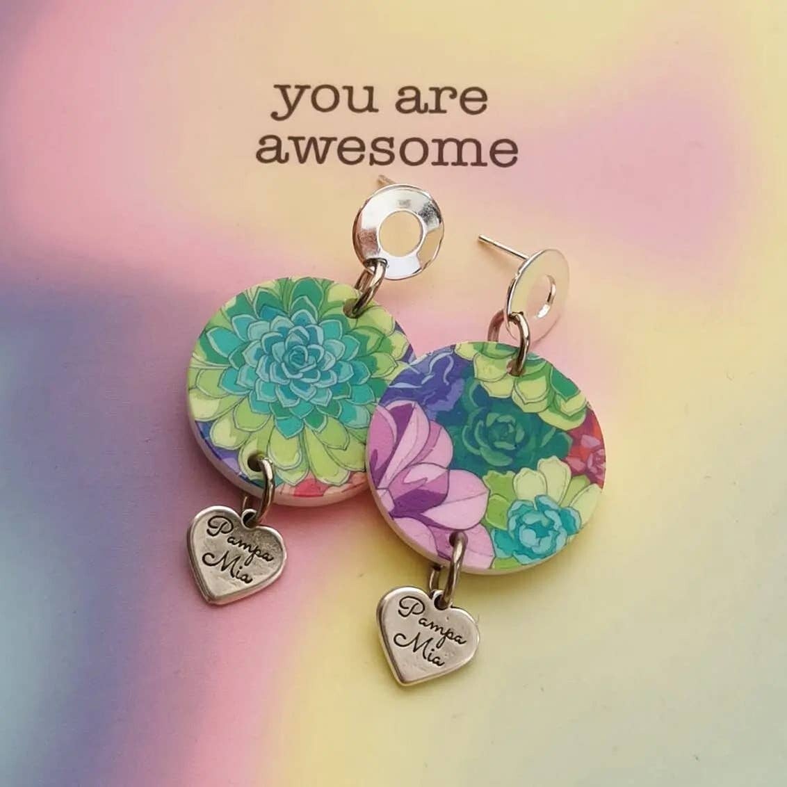 Oorbellen met zilveren of gouden sluiting en hangers van acryl met bloemmotieven in de kleuren groen en blauw.