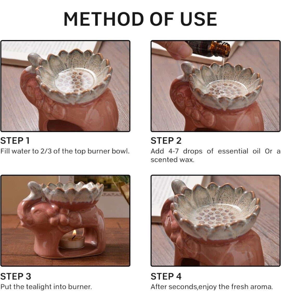 Voor etherische olie: Vul het reservoir van de aromabrander met water. Voeg ongeveer 4 druppels etherische olie toe aan het water. Ontsteek een theelichtje en plaats deze onder in de aromabrander. Geniet van het heerlijke aroma.
