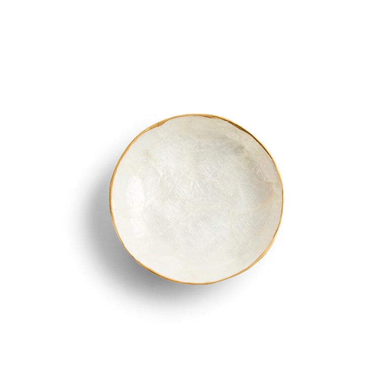 Dit schaaltje is gemaakt van de Capiz schelp, het is een rond schaaltje met een gouden randje. De Capiz schaaltjes kun je op verschillende manieren gebruiken, leuk om bijvoorbeeld een geurblokje op te leggen. Maar ook als sieraden schaaltje.