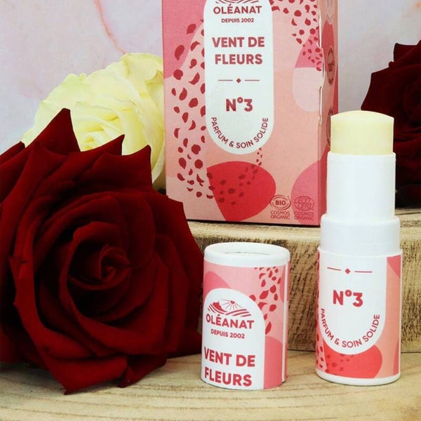 Natuurlijke solide parfum zonder alcohol, met kwaliteitsgrondstoffen zoals karitéboter (shea butter), cacaoboter en plantaardige was. Met zonnebloemextract, een sterk hydraterend actief bestanddeel. Parfumeert en hydrateert de huid in één handeling.