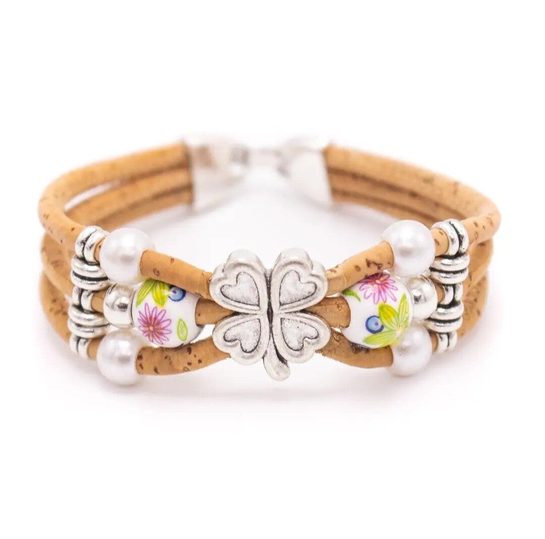 Unieke kurkarmbanden, voorzien van zilveren sliders en elk twee stenen.