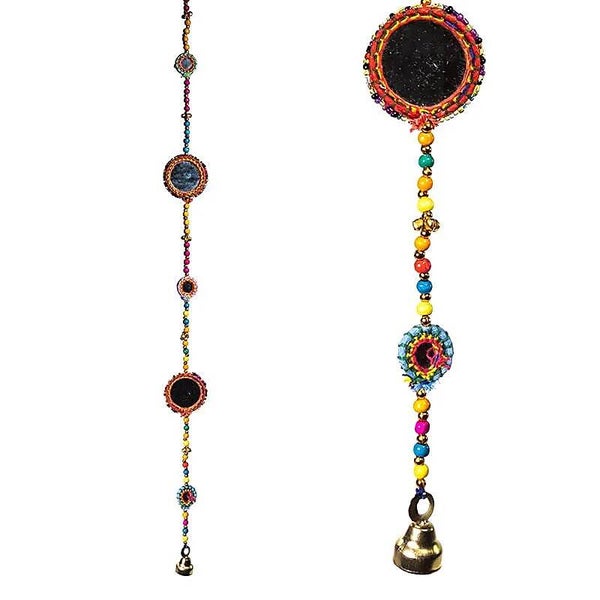 Kleurrijke, speelse slinger met 5 stoffen olifant, hartjes of spiegeltjes en belletje.